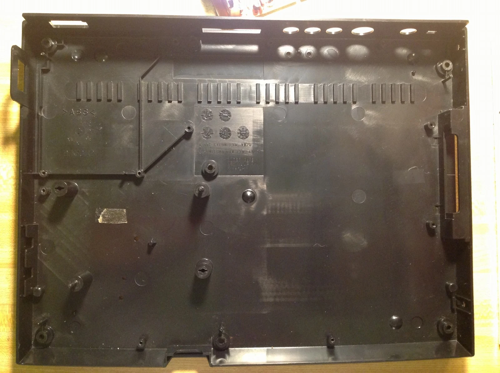 The power board is a bigger pain to deal with, so I'll start with the RF shield. It is glued to the bottom of the case near the expansion port on the right. You can see in the picture that the metal is bent in that spot; it took a lot of force to remove, but it might be necessary if yours is infested with bugs like mine was.